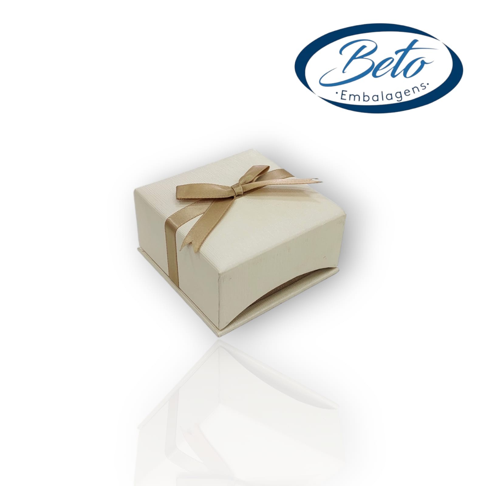 Estojo para joia ou semi-joia de papel trabalhado na cor champanhe, possui laço dourado na parte superior.