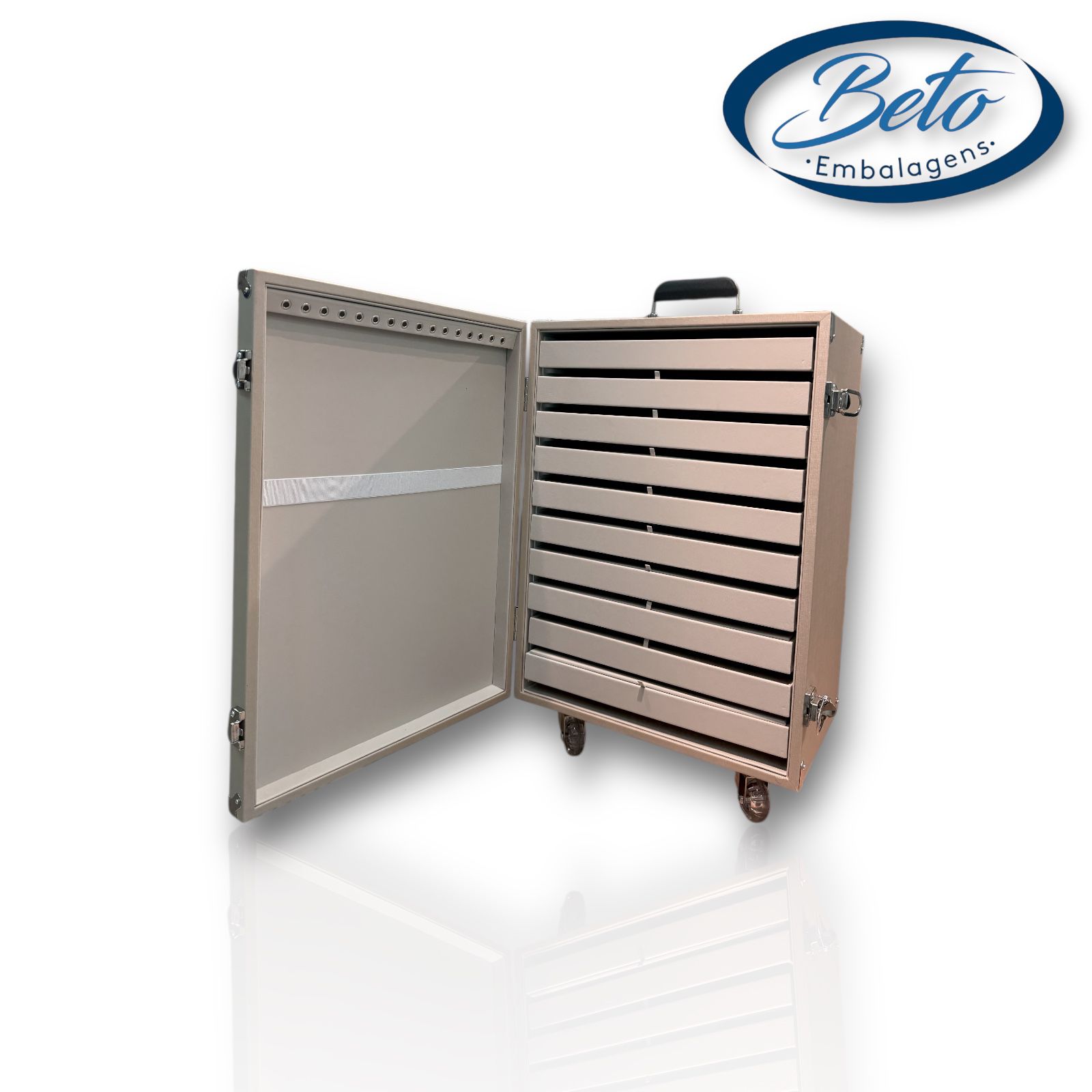 Mala com 10 bandejas para joias, confeccionada em MDF, revestido em couro sintético externamente e internamente. Possui rodinhas com giro 360 para transporte, porta correntes na tampa, fechos com chave, alça fixa, alça telescópica e cantoneiras para proteção.