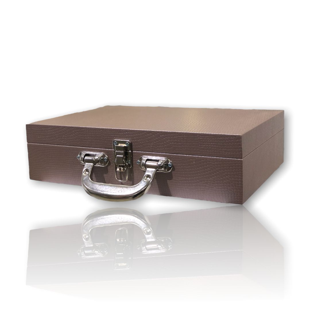 Maleta Porta Jóias confeccionada em madeira e revestida em couro sintético, internamente em veludo.