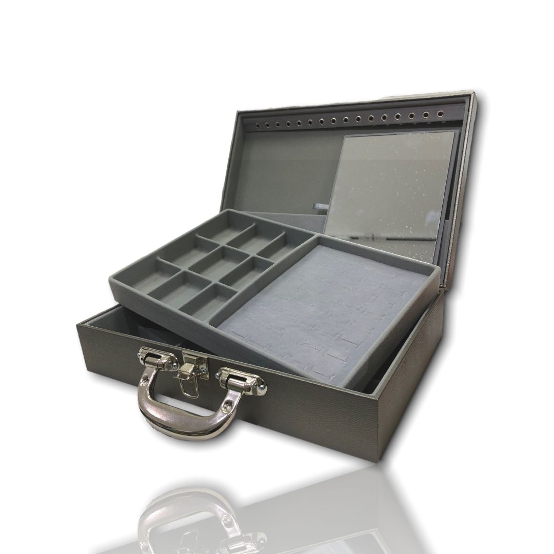 Possui porta correntes, bandeja removível, porta anéis, porta brincos e espelho móvel (na tampa que protege os nichos da bandeja).
