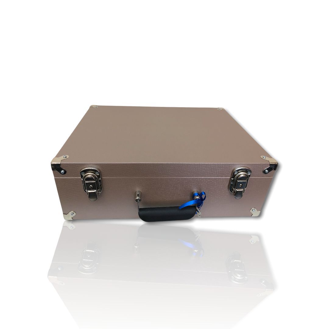 Maleta com 2 bandejas inclusas, de tamanhos 27 x 27 x 3 cm (cada bandeja), 12 divisões no fundo da mesma e porta correntes com proteção magnética na tampa (18 CORRENTES)