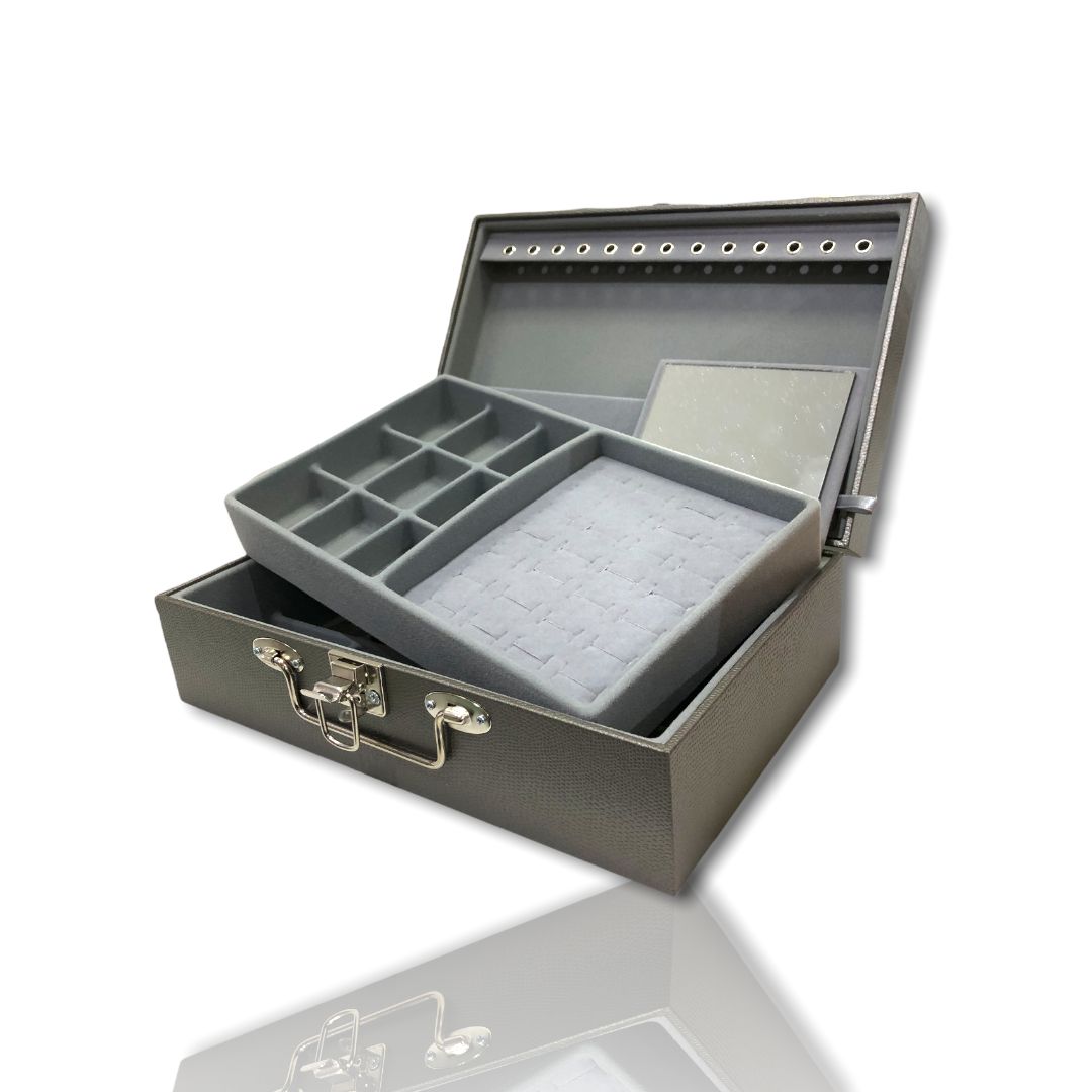 - Maleta para jóias confeccionada em madeira, com revestimento externo em couro sintético e interno em veludo de 1ª linha. - Possui porta correntes, bandeja removível, porta anéis, porta brincos e espelho móvel (na tampa que protege os nichos da bandeja) e compartimento para organização pessoal. - Produto com alto padrão de acabamento - Este produto é indicado para quem deseja organizar ou expôr suas peças. Não é indicado para vendedores ou representantes devido ao seu tamanho. Caso queira um produto para trabalhar vendas, recomendamos o Porta-Joias Grande Duplo ou o Grande Triplo. |